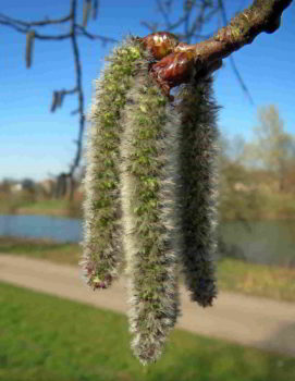 Fiorisce tra marzo e aprile, i fiori si presentano in amenti penduli, con colori diversi per i femminili e i maschili.
